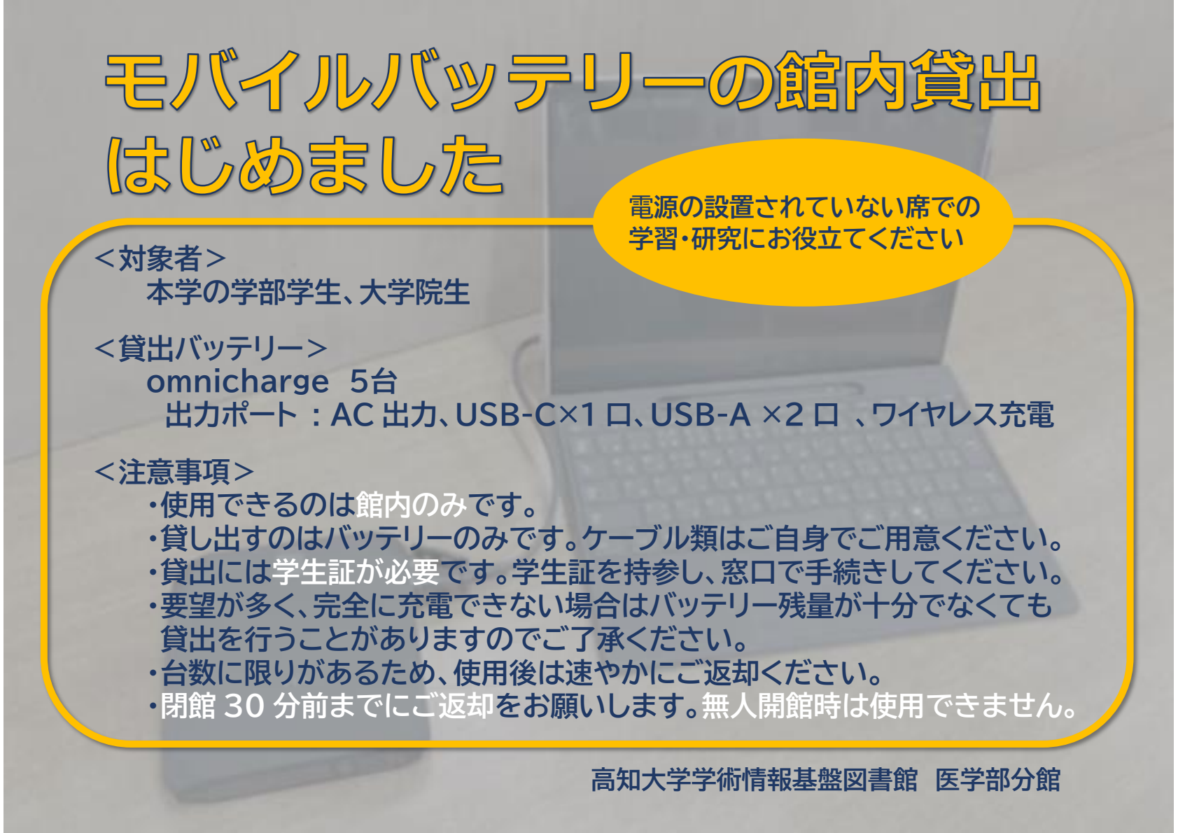 【医学部分館】モバイルバッテリーの館内貸出をはじめました