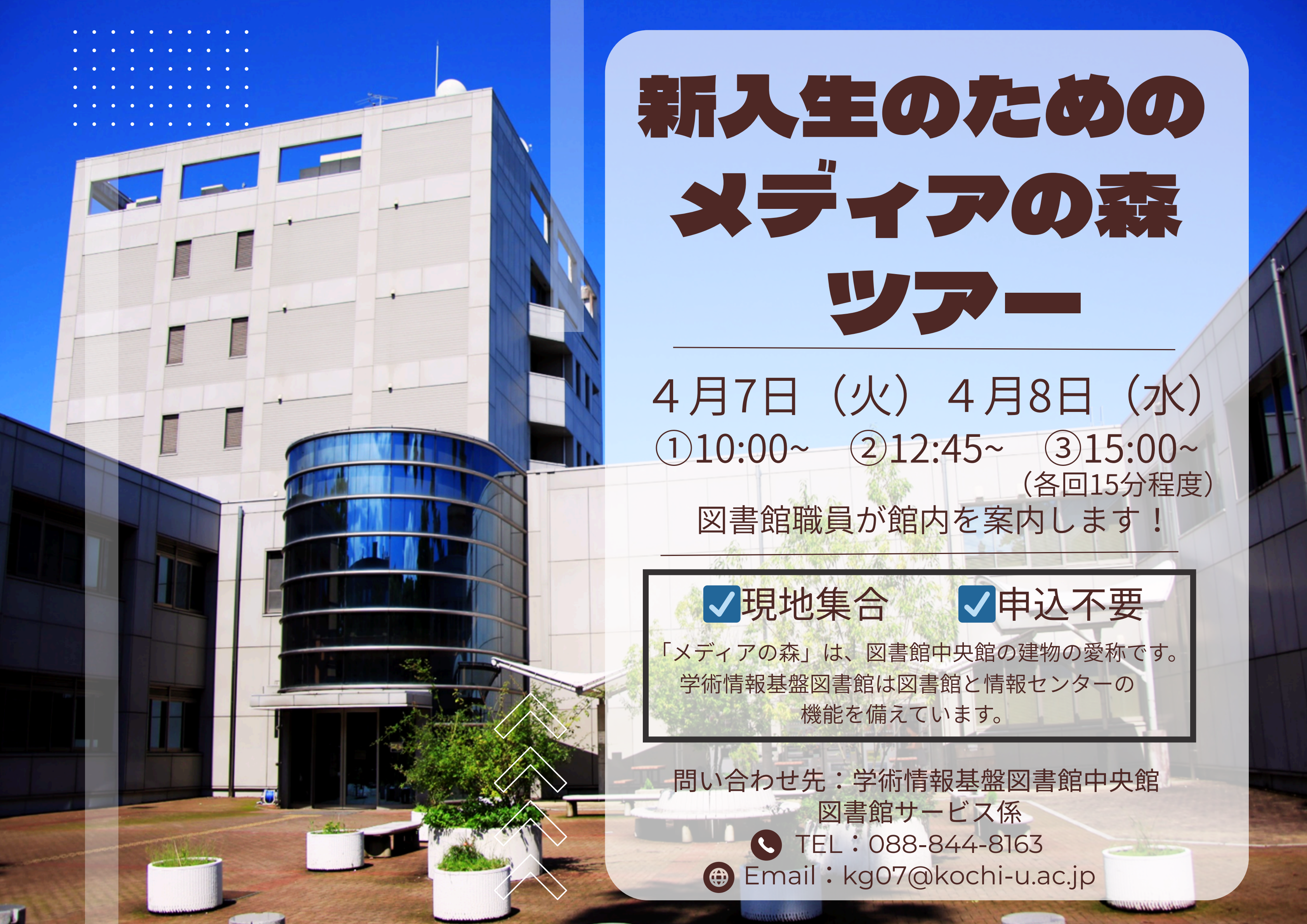 開催日時:4月7日(火)・8日(水)①10:00~ ②12:45~ ③15:00~(15分程度)