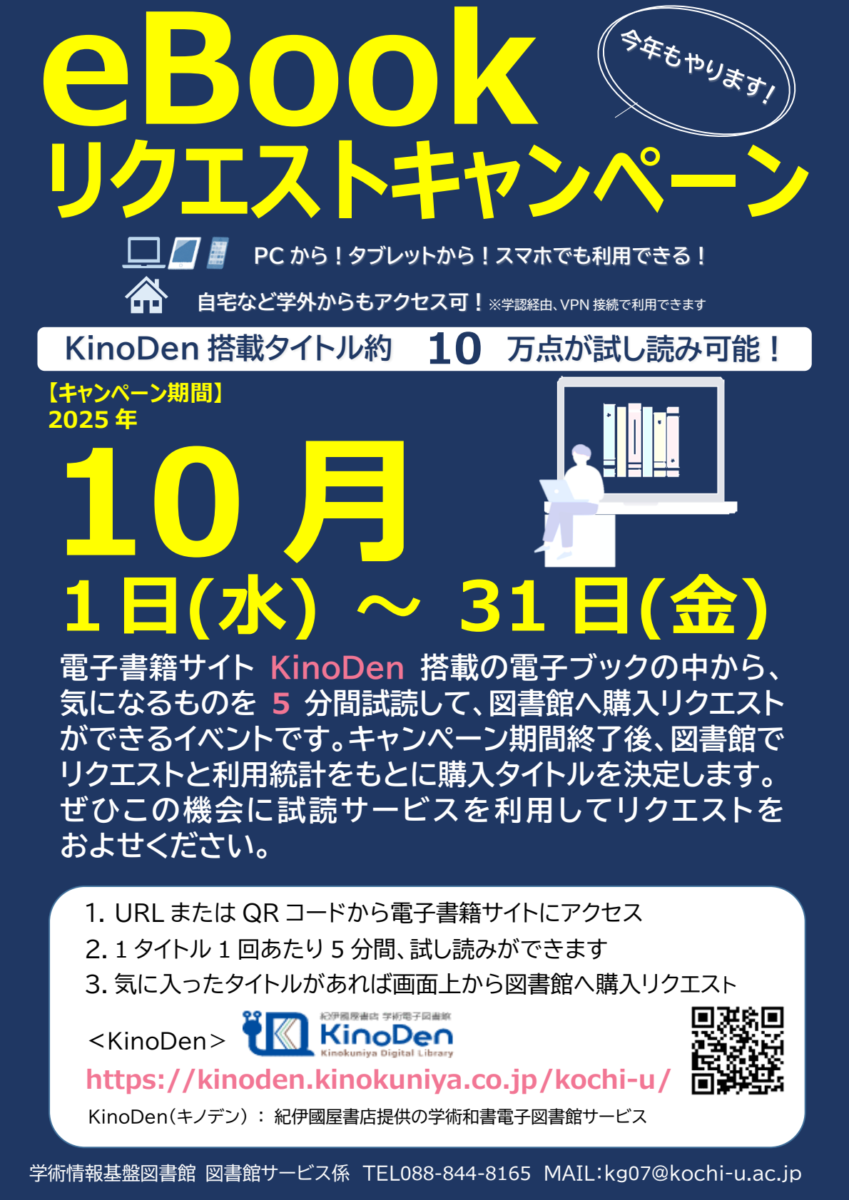 昨年に続き、今年も電子書籍サイト〈KinoDen〉の試読サービスを利用したeBookリクエストキャンペーンを実施します。